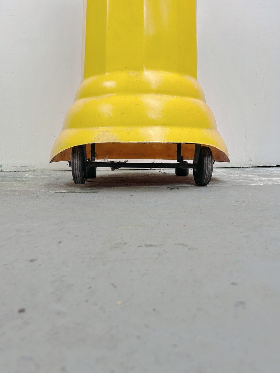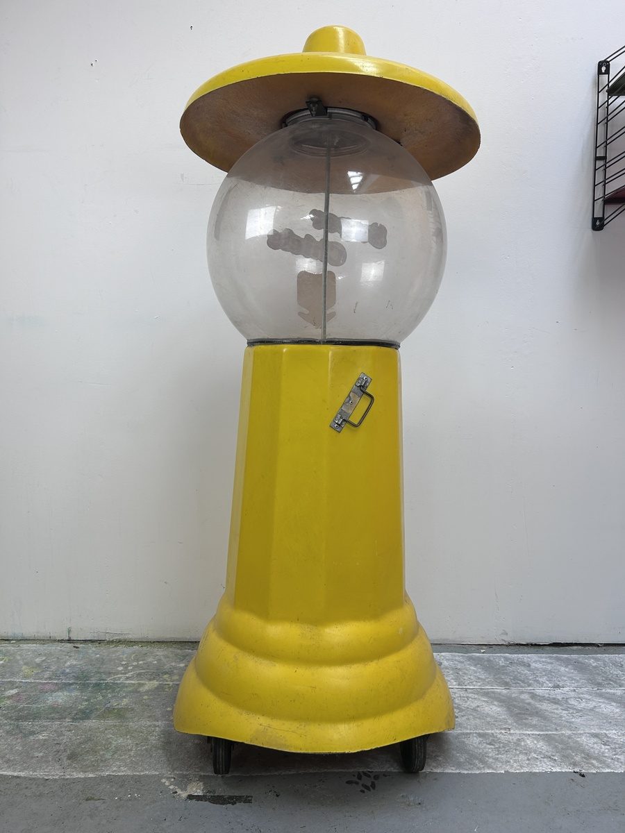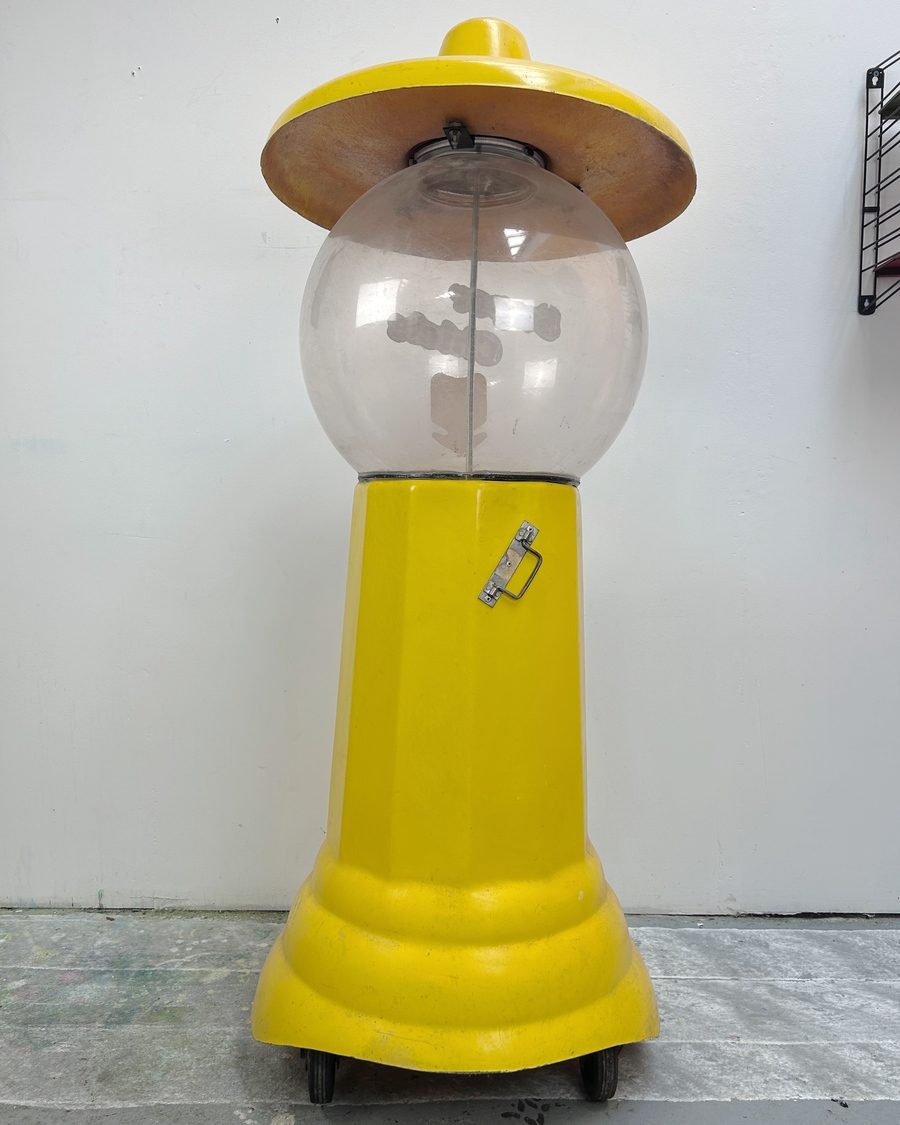 Un distributeur de chewing-gums vintage tout droit venu d’une ancienne friterie belge des années 60, avec son grand chapeau jaune et son look ultra rétro. Fonctionnel, imposant et plein de peps !