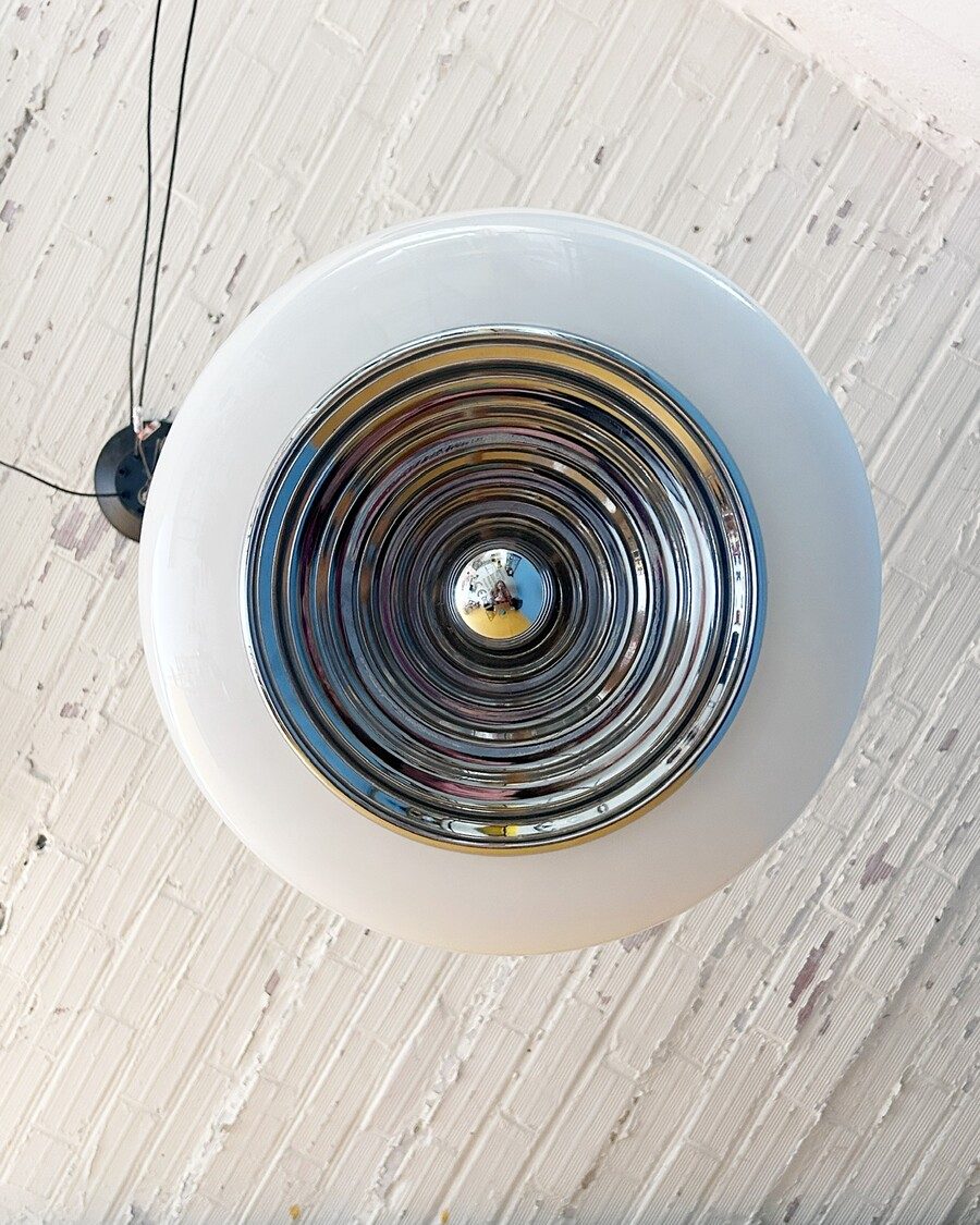 Avec son globe chromé, son large abat-jour en verre opalin et son ampoule centrale apparente, cette suspension évoque irrésistiblement une planète stylée venue tout droit des années Space Age.